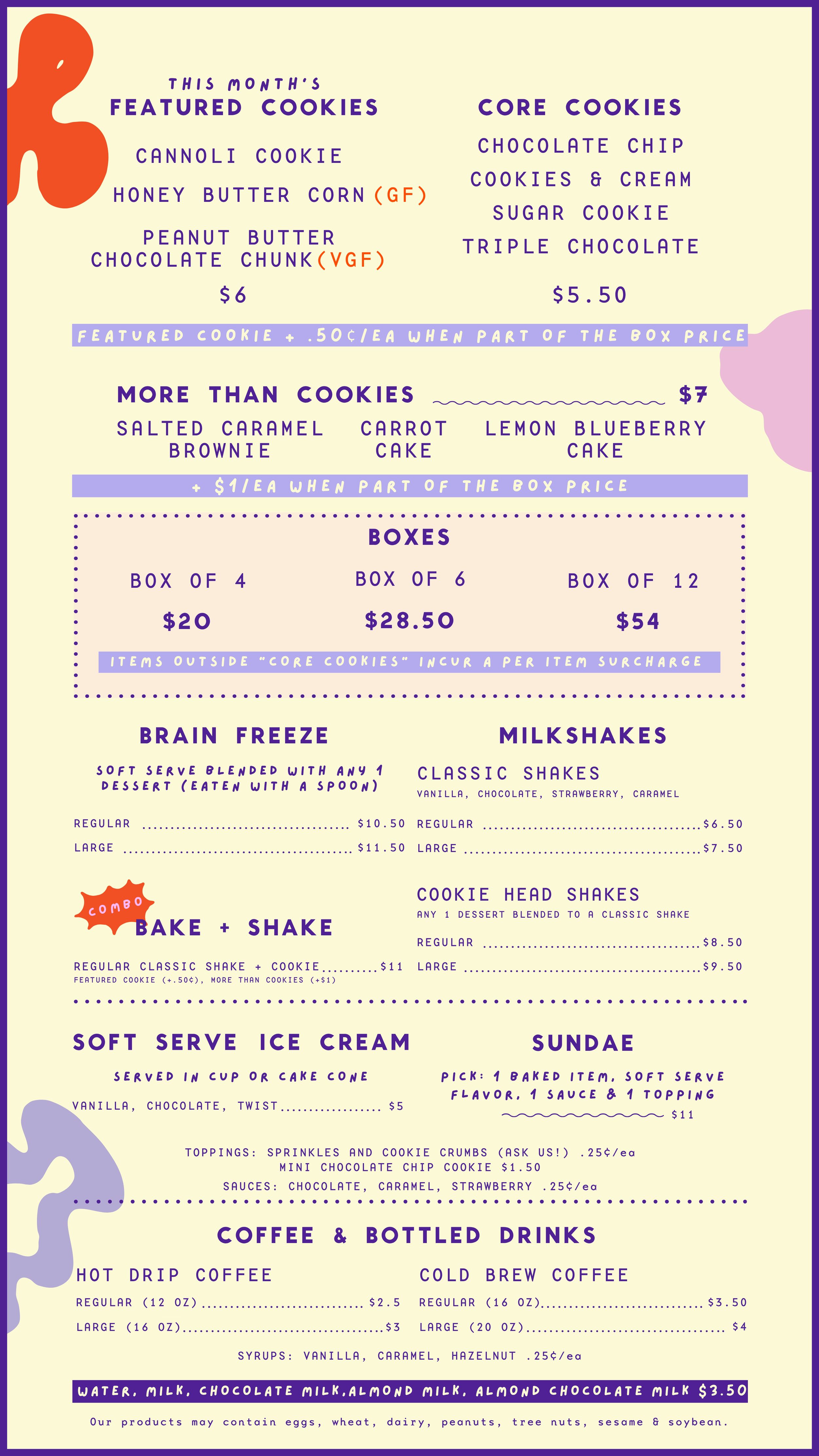 Our menu includes 4 core cookies that are always on the lineup, plus a rotating selection of monthly flavors featuring cookies and other baked goods. We also offer vegan and gluten-free options, along with limited-edition items that appear for a short time. There’s always something new worth trying.